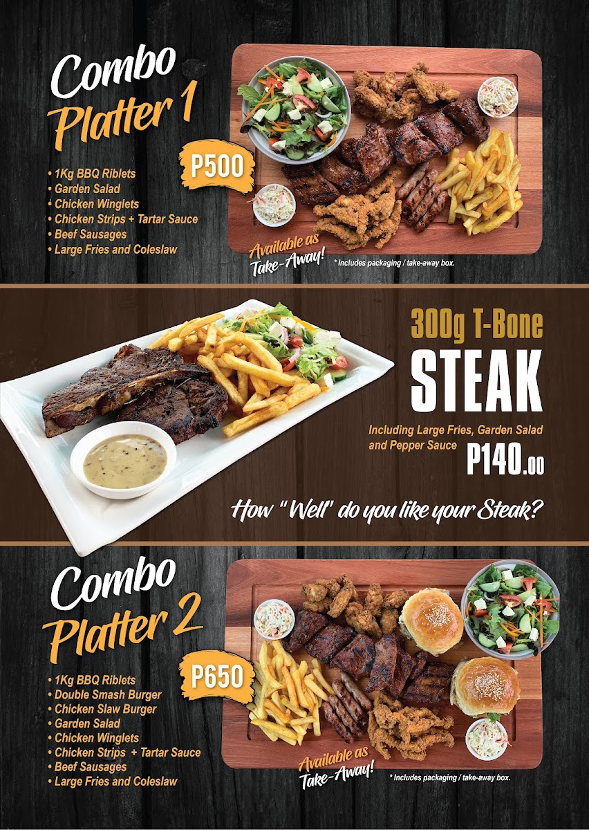 Approximately 1KG Pork riblets basted in sweet, sticky BBQ sauce, flame grilled, served with salad + fries. Half portion (Approx. 500g) available for P190